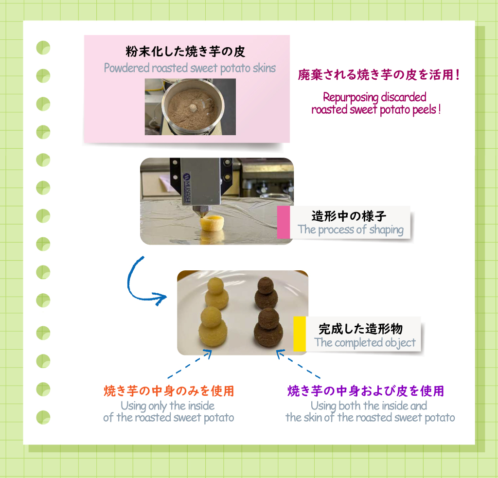 고구마의 껍질을 활용한 3D 조형에 임했습니다.통상, 고구마의 가죽은 「 딱딱하다」 「쓴다」라고 하는 이유로 사양되는 것이 많아, 폐기되어 푸드 로스의 한 원인이 되고 있습니다.거기서, 고구마의 껍질을 전자레인지로 건조시키고 분쇄기로 분말화.그 분말을 재료에 몇 % 첨가하여 3D 조형을 실시했습니다.그 결과, 고구마의 내용만을 사용한 경우와 손색이 없는 매끄러운 마무리를 실현했습니다.