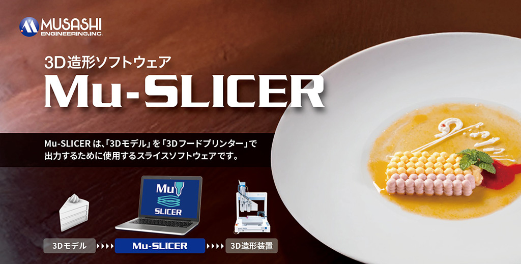 Mu-SLICER는 당사가 독자적인에 개발한 슬라이스 소프트로, 당사가 디스펜서 업계에서 쌓아온 묘화에 관한 노하우를 응축하고 있으며, 액체 재료를 제어하기 위한 3D 푸드 프린터에 필요한 기능이 담긴 소프트웨어입니다.