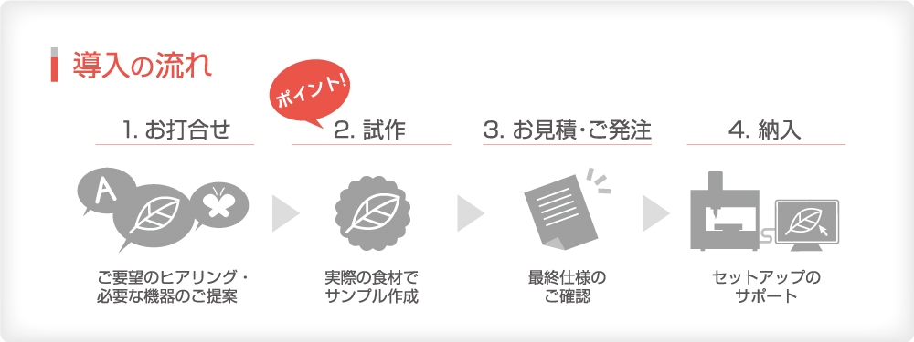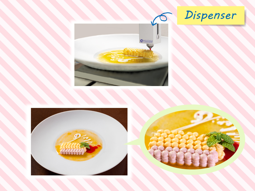 당사는 디스펜스 기술의 핵심 기술을 3D 푸드 프린터에 적용하고 있습니다.이 기술을 통해 2D의 묘화와 오너먼트 제작부터 3D 조형까지 다채로운 패턴의 조형을 1대의 프린터로 실현할 수 있습니다.3D 푸드 프린터로서의 활용은 물론 생산 능력이 요구되는 용도에 있어서는 2D 조형을 조합하여 더욱 혁신적인 상품 개발을 기대할 수 있는 것은 아닐까요?