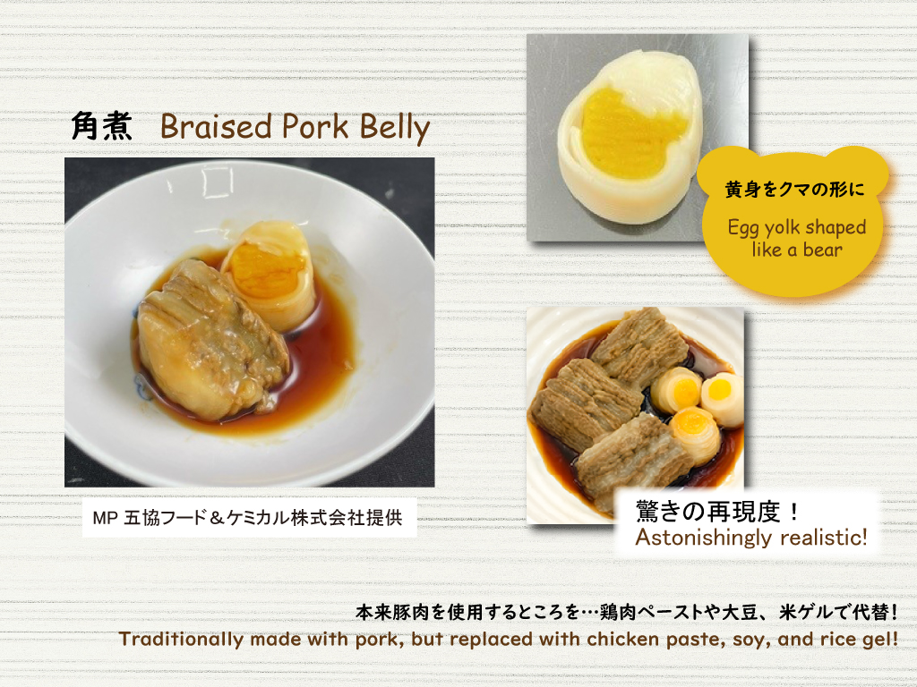 통상은 돼지고기를 사용하지만, 칼로리 컨트롤이나 비간 대응을 위해 닭고기를 페이스트 형태로 한 재료나 식물 유래의 대두를 베이스로 사용하는 등 개인의 체질·신조·기호에 맞춘 식재료를 선택할 수 있습니다.지신 부분에 대해서는, 이번은 유지를 사용하지 않고 지신님의 식감을 주는 첨가제(겔화제)를 사용했습니다만, 코코넛 오일 등 자연 유래의 재료를 활용하는 것도 생각할 수 있습니다.