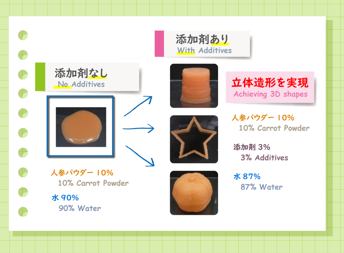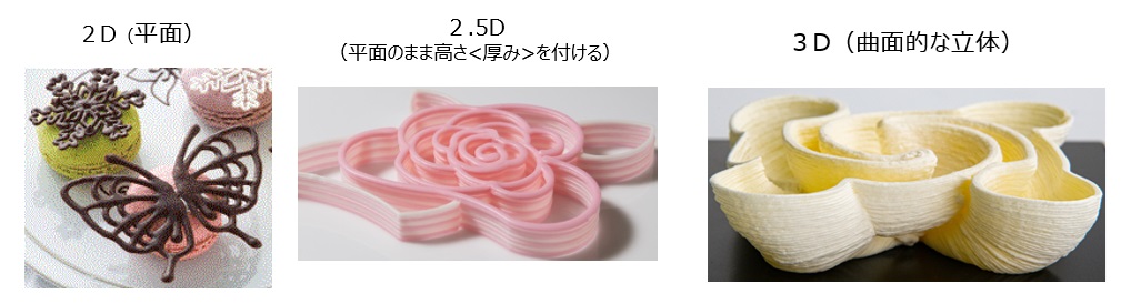 이러한 재료 자체가 안고 있는 문제를 해결하는 데 도움이 되는 것이 첨가제입니다.물과 같이 유동성이 높은 재료라도 첨가제를 더하는 것으로 점성을 갖게 하고 형태를 유지할 수 있게 됩니다.또한 3D 푸드 프린터 기술을 조합하여 입체적인 조형을 실현할 수 있습니다.