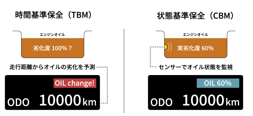 예를 들어 자동차를 예로 들면, 엔진 오일 교환은 차량의 주행거리나 기간으로 판단하여 정기적으로 실시하는 것이 일반적입니다.자동차의 주행 조건에 따라 기준은 다르기 때문에 운전자가 정확하게 교환이 필요한 시기를 산출하는 것은 어렵습니다.최근에는 단순한 주행거리뿐만 아니라 엔진의 회전수나 단거리 주행 빈도 등을 복합적으로 판단하여 오일의 교환 촉진 차량이나 직접 오일의 품질을 측정하고 있는 차량도 탄생하고 있으며, 이러한 차량이 제공하는 정보는 보다 정확하게 오일의 열화를 판단하여 적절한 타이밍에 메인터넌스를 가능하게 하고 있습니다.
