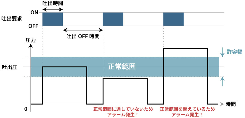 당사의 에어펄스 방식 디스펜서 중 ML-8000X와 SuperΣCMIV 시리즈는 새로운 기능으로 ‘토출 압감시’ 기능을 탑재하고 있습니다.이에 따라 토출 동작마다 디스펜서에서 나오는 압력이 설정대로인지 감시할 수 있습니다.토출에 이상이 있던 타이밍을 알람으로 아는 사용법은 물론, 그 경보 빈도와 고객의 생산현장에서 불량 발생 상황을 조합하고 상관을 분석함으로써 메인터넌스의 타이밍을 최적화하고 쓸데없는 비용을 줄일 수 있습니다.