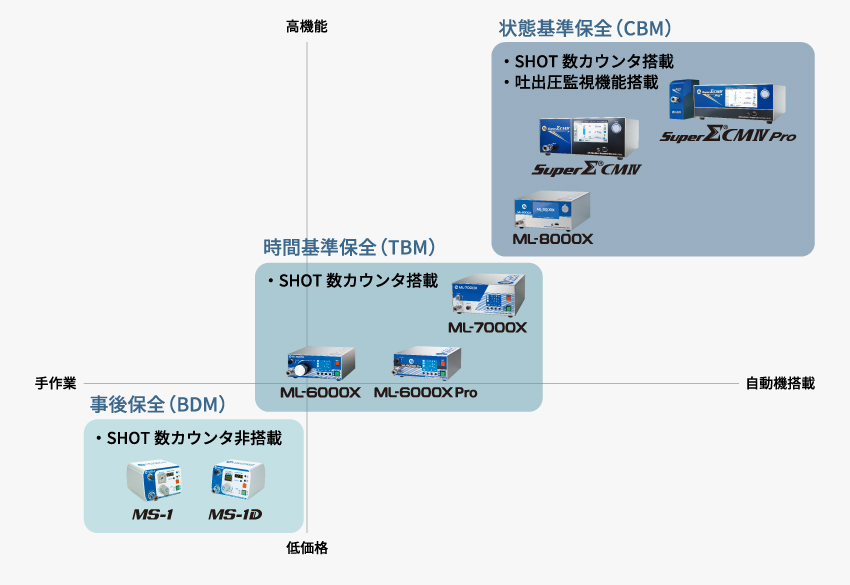 디스펜서뿐만 아니라 제조 장치에서 중요한 설비 보전 방법은 사후 보전(BDM)에서 예방보전(TBM, CBM)으로 진화하여 미래의 예지보전(PdM)으로 향하고 있습니다.본 기사에서는 각 특징과 메리트를 비교해 당사의 관련 제품을 소개합니다.사후 보전(BDM)은 가장 기본적인 보전 방법